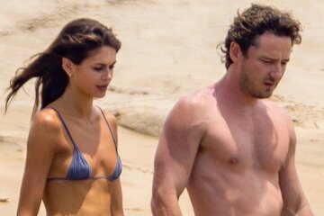 Paparazzi caught Gerber and 33-year-old Pullman at a beach: they strolled along the shore before diving into the water. Kaia was wearing a blue micro bikini.